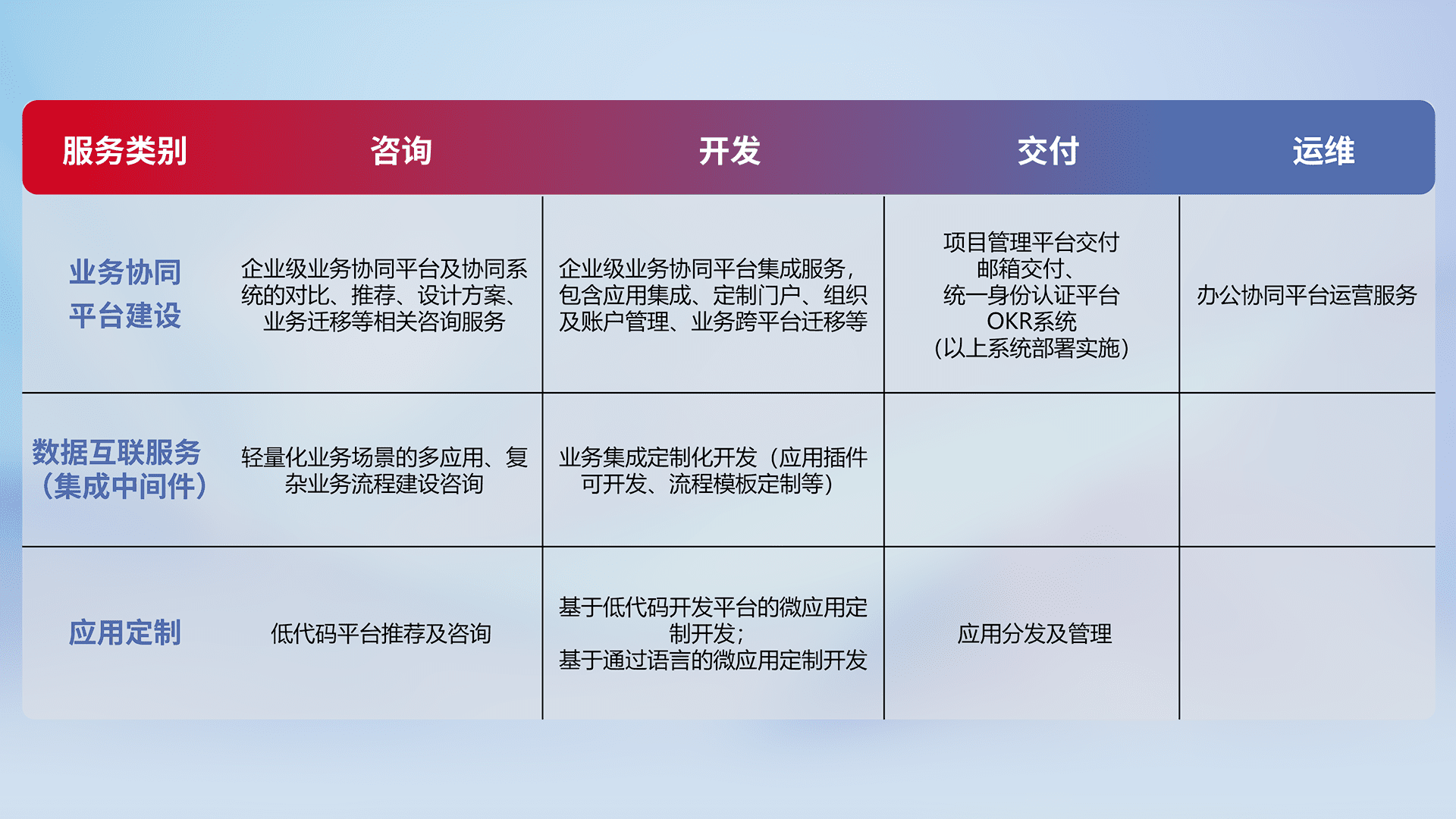 针对钉钉、、、企微、、、、IDaas等平台级产品提供产品的规划、、、、方案、、、交付、、定制化开发等服务,,实现如统一协同办公、、智能客户服务、、混合会议管理、、、智能数据查询、、等业务场景,,,,实现数字化转型。。。。